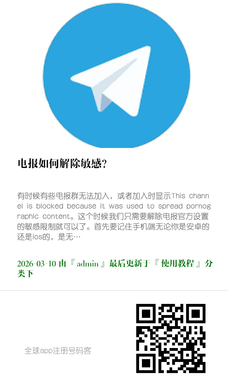 有时候有些电报群无法加入,或者加入时显示This channel is blocked because it was used to spread pornographic content。这个时候我们只需要解除电报官方设置的敏感限制就可以了。